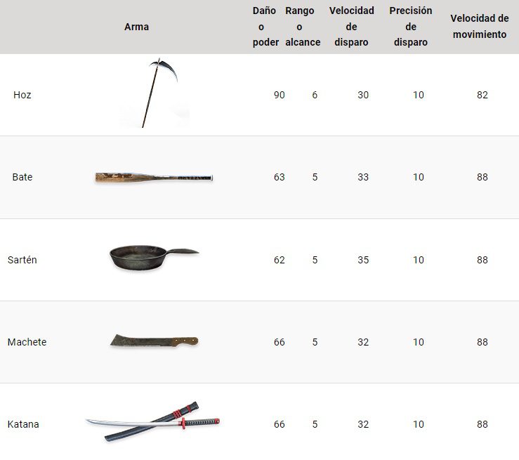 | Arma | Daño Base | Tasa de Disparo | Alcance Óptimo | Características Adicionales |